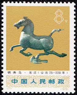1990年在四川绵阳市何家山二号汉墓出土的东汉铜马(图7),是国家一级文物,为全国现存最大的汉代青铜马。1996年在甘肃武威出土的铜奔马(图8)更是一件青铜绝品。铜奔马的铸型采用夸张手法,把奔马的全部重量落在一只脚上为支点,这只脚又巧妙地踩在飞雁上,形成了奔马的速度超越飞雁的感觉。铜奔马在1983年认定为了中国旅游标志。