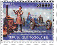 1839年,美国人固特异(C.Coodyear)一次偶然的机会,发现硫黄可以使橡胶固化,并使之在较广的温度范围内仍然保持橡胶的固有弹性。这一橡胶的“硫化”过程推动了橡胶制品的迅猛发展。图2是多哥发行的纪念固特异发现橡胶“硫化”过程的邮票。1895年第一条充气汽车轮胎问世,这给轮胎业带来迅猛发展的机会,汽车轮胎开始进入商品生产阶段,成为天然橡胶的主要消耗者。同时轮胎的大批量生产也推动了橡胶工业的蓬勃发展。