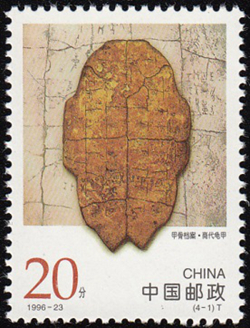 在纸发明以前,中国古代所用的书写材料主要有甲骨、金石、简牍、缣帛、等。甲是乌龟壳,骨是牛羊等动物的肩胛骨。1899年,清末国子监祭酒(相当于今中央教育机构最高长官)王懿荣无意中在一味中药“龙骨”上发现了刻划的痕迹,经大量搜集研究,确认是一种古代文字,此即甲骨文发现之始。图2邮票所选用的甲骨档案,是1991年10月从河南安阳殷墟出土的一块完整的商代后期甲骨文龟甲,记录了一位殷商贵族外出狩猎的过程。“金石之刻”是指在青铜器上刻字。著名的虢季子白盘(图3),就是在盘的内底处铸有铭文111字,记述虢季子白率军对狁作战,斩敌首500,俘虏50人,战后献馘,周宣王宴飨虢季子白,并赏赐马、弓矢、钺以资勉励。以钟铸字、石上刻字都是古代常用的记事方法。