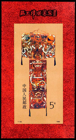 马王堆一号汉墓帛画1972年出土于湖南省长沙市马王堆1号墓,是迄今发现的汉代最早的独幅绘画作品。这幅帛画用单层的细绢作地,绢地现呈棕色,呈T形,上宽下窄。其制作方法是用三块绢帛拼成,中间用一长条整幅的绢,再取相当于长条三分之一的绢裁成两半,分别拼缝在长条上部的两侧。顶部裹有一根竹竿,并系以棕色的丝带,以便张举悬挂。中部和下部的两个下角,均缀有青色细麻线织成的筒状绦带,长均为20厘米余。画面呈“T”字形,画面完整,形象清晰,自上而下分段描绘了天上、人间和地下的景象,描绘出许多代表祥瑞的图案如龙、虎、鹿、凤和仙人等(图5)。