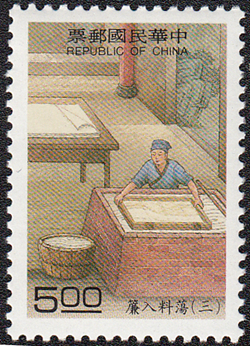 隋唐以后,造纸的原料扩展到竹类、麻类、楮皮、桑皮、瑞香皮、木芙蓉皮等,标志着植物茎杆纤维造纸的时代出现。造纸原料的扩充、纸品的增加、生产设备的改进、加工技法的创新等,印刷品成为纸的主要用途。明清时期是中国传统造纸术的集大成阶段,纸工们在总结前朝经验的基础上,所造出的纸在质量、产量、用途等方面都有所发展。大量论述造纸技术的书籍也开始出现,《天工开物》的“杀青卷”中,记述了造竹纸、皮纸的生产工艺,还附有清晰的插图,形象地表明了从原料砍伐、挑选、蒸煮到捞纸、压榨、烘干成纸的主要工序。图9为台湾发行的根据《天工开物》插图制作的有关造纸邮票。