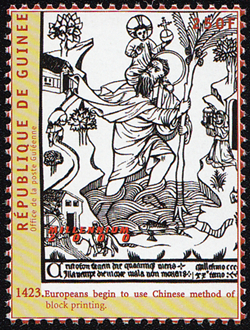 由于地域的便利,纸和造纸术首先传入与我国毗邻的亚洲国家。纸的西传是经过新疆边界而传出的,据说是在战争中由被俘的纸工把造纸术传出的。西班牙是第一个用纸书写的欧洲国家,也是第一个掌握造纸术的欧洲国家。约在1150年,西班牙第一家纸坊在生产亚麻的萨蒂瓦设立。1157年在靠近法国的比达隆建立由基督徒经营的纸坊。早在12世纪意大利已使用纸,它是由大马士革经君士坦丁堡、西西里传入意大利。意大利最早的纸坊建于1268~1276年。此后,逐步传遍整个欧洲。17世纪以后,欧洲移民把造纸术带到美洲。图10为几内亚发行的印刷术传入欧洲的邮票。到19世纪,中国的造纸术已传遍了整个文明世界。