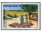 人类在大自然馈赠的熟食中发现了熟食的种种好处,如味道香浓、益于消化、利于健康等,于是开始以火为热源进行烧烤煮,并就地取材发明了既是煮具又是容器的陶器。陶器烧制的一般过程是选择好制陶的黏土,将其用水湿润成具有一定可塑性的土团,再将其捏成一定的形状,干燥后用火烧烤加热,使之烧结成为坚硬的陶器。制陶原料大多是就地取材,只要用手捏塑和架火烧烤,就可获得自己设计赋形的陶器。在以妇女为中心的母系氏族社会,男子专事渔猎,女子则承担制陶。在群聚的原始部落村庄边上都会有制陶的场所。制陶成为部落成员改善和提高自己生活质量的一种手段。当生产的陶器富余时,也会拿到集市上贩卖或交换其他物品中。图2、图3是尼日尔发行的妇女制作陶器并进行陶器交换的邮票。