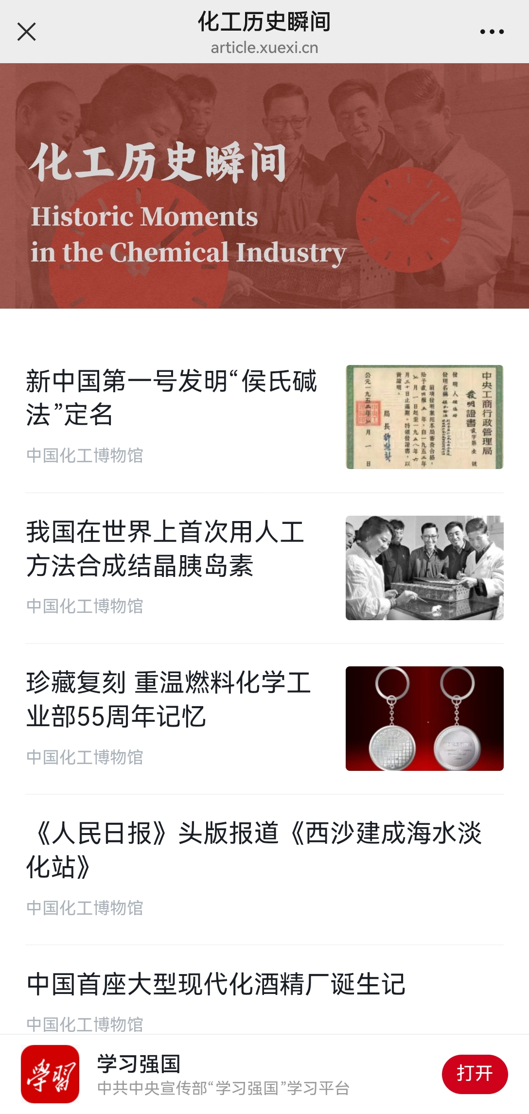 本次“学习强国”平台收录的7篇专题文章,涵盖《新中国第一号发明‘侯氏碱法’定名》《我国在世界上首次用人工方法合成结晶胰岛素》《中国首座大型现代化酒精厂诞生记》等化工行业重要历史事件,以生动瞬间为化工行业的发展留下鲜活注脚。