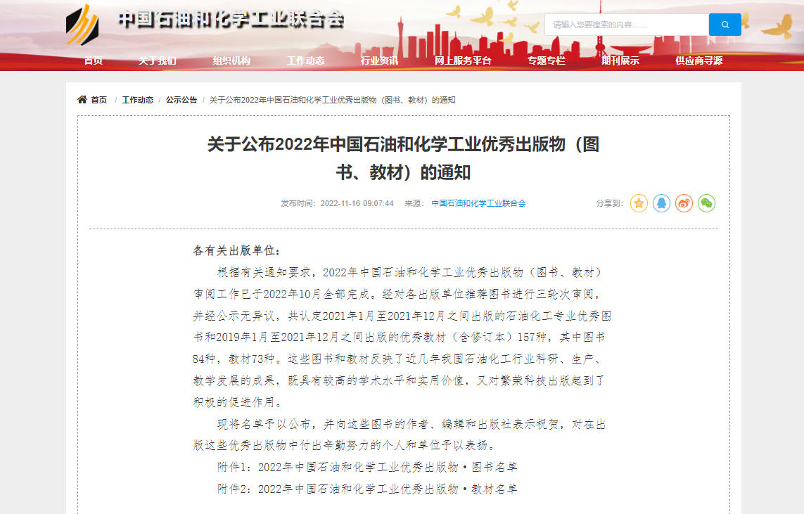 此前,在国家新闻出版署印发的《出版物“十四五”时期发展规划》中,《中国化学工业百年发展史》就曾荣列“自然科学与工程技术出版规划”项目。本次获选2022年中国石油和化学工业优秀出版物,是化博学术成果得到的再一次肯定。