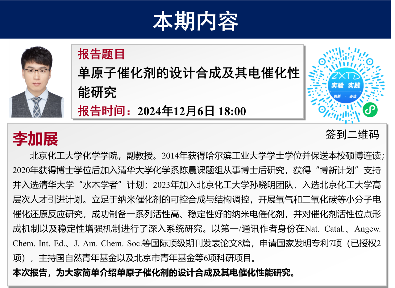 北京化工大学李加展副教授以单原子催化剂的设计合成及其电催化性能研究为题,