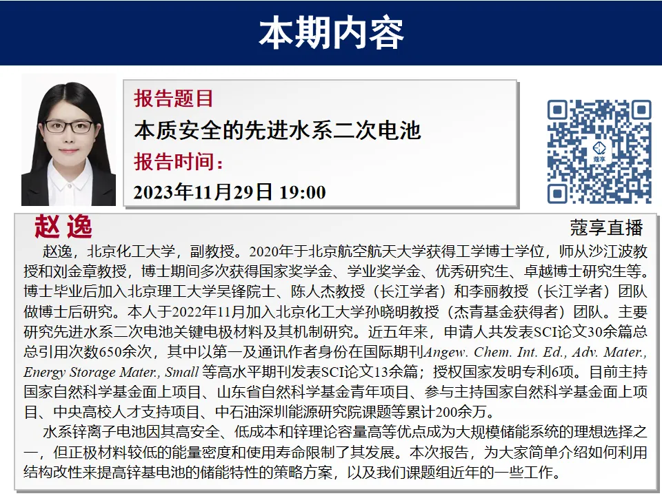 北京化工大学赵逸副教授以“本质安全的先进水系二次电池”为题,