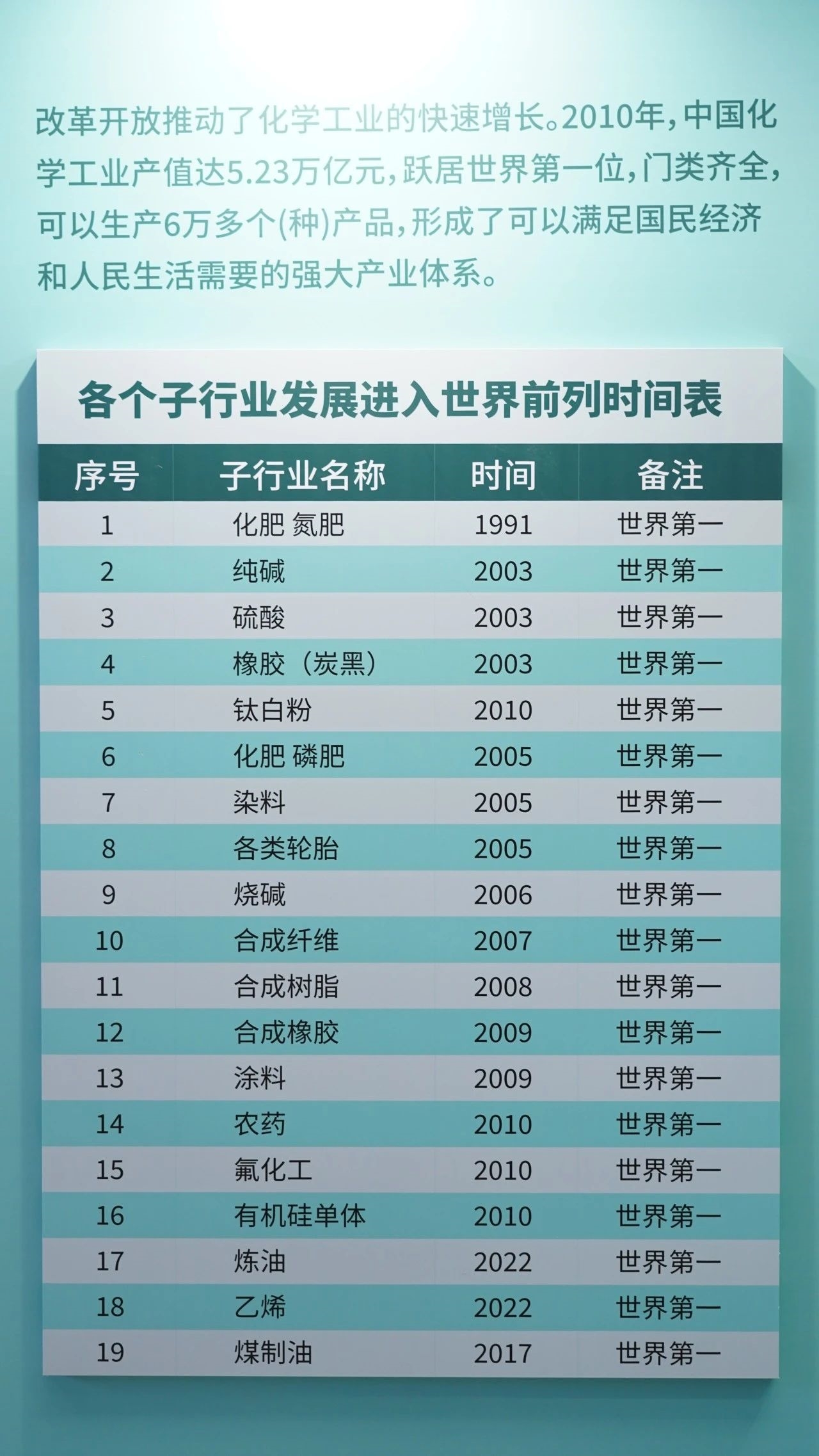 改革开放推动了化学工业的快速增长。2010年,中国化学工业产值达5.23万亿元,跃居世界第一位,多类化工子行业跻身世界前列。