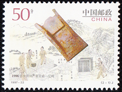 在新石器时代早期,人们在采集石料中,偶尔发现了与一般岩石不同的天然红铜,它质地柔软,可以锤打成一定形状的小器物,这属于物理性质的加工。从使用自然铜发展到熔铸铜、开采铜矿石冶炼合金铜经过了漫长的岁月。人们逐渐掌握了在陶质器皿中将红铜加热熔化,并用陶范或石范使熔化的红铜铸模成型。热铸比冷锤赋型更为方便,较少受到原料多寡、形状的限制,所以得到了推广和发展。图2是中国古代冶金的邮票,主图为古代的铁范,背景为《天工开物》中描绘的炒钢技术。