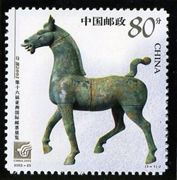 沧州铁狮子铸造于后周广顺三年(953年),工艺堪称奇绝。狮身毛发呈波浪状或作卷曲状,披垂至颈部,胸前及臀部飘有束带,带端分垂于两肩及胯部。狮身内外还有许多铸文,腹腔内有以秀丽的隶书字体铸造的金刚经文。这件总重3万公斤的铁狮是古人采用一种特殊的“泥范明铸法”,分节叠铸而成。铁狮腹内光滑,外面拼以长宽三四十厘米不等的范块,逐层垒起,分层浇注,共用范544块拼铸而成。凭1000多年前的手工冶铸技术,能铸造出如此庞然大物,足见其制模、冶炼、浇铸工艺是相当高的,充分显示了我国古代铸造工艺的高度成就。图6是沧州铁狮子邮资封票。