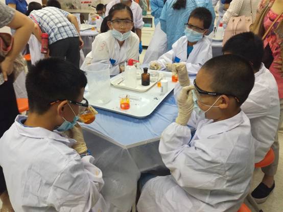 这次活动包括参观博物馆和趣味化学实验两部分。在讲解员的带领下,孩子们进入了一个化学的缤纷世界,他们显得很兴奋,不时提出各种各样的问题,对博物馆的每一件展品都充满好奇,对互动展项更是爱不释手。在趣味化学实验中,孩子们穿戴好实验服装,戴好护目镜及手套,俨然一个个化学工程师。实验室的老师为孩子们表演了神奇的“口吐火焰”“掌中火”“消失的彩虹”等绝活,孩子们不时为老师魔法师般的表演欢呼雀跃。在实验室老师的指导下,孩子们动手完成了 “五色瓶”“法老之蛇”“阿拉丁神灯”等实验,这些实验让孩子们通过颜色的变化,明白了化学中的“氧化反应”,了解了气体产生对物体形态的影响以及化学在水凝胶领域的应用。