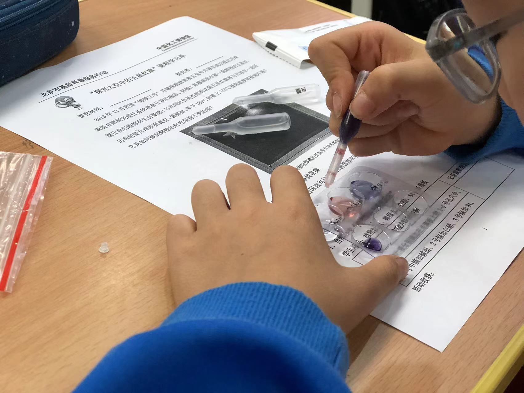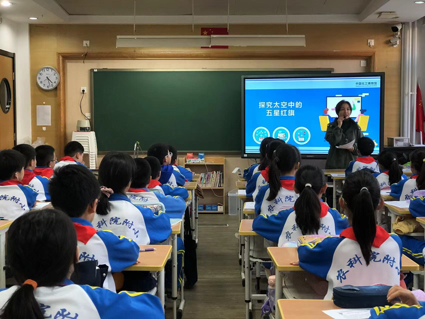 在农科院附小的课堂上,中国化工博物馆的老师以博物馆珍贵藏品开启了趣味课题,同学们跟着一面五星红旗的藏品,了解国旗如何在太空中,不畏月球表面真空,强辐射以及从零下180摄氏度到零上150摄氏度的极限温度等极端环境中,仍然展示着鲜艳的中国红。透过藏品,认识其背后的化学知识,同学们观察学习植物颜料和矿物颜料的性质,了解电镀法在物质表面形成覆涂层的方法。通过奇妙实验锻炼了观察、描述、记录的基本技能,培养了探究、提问、思考的科学精神。