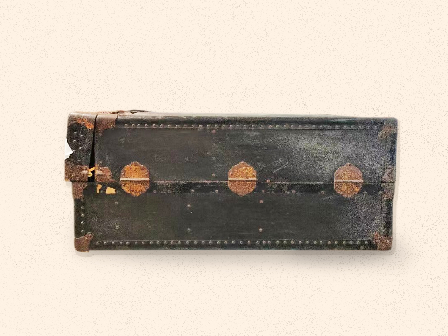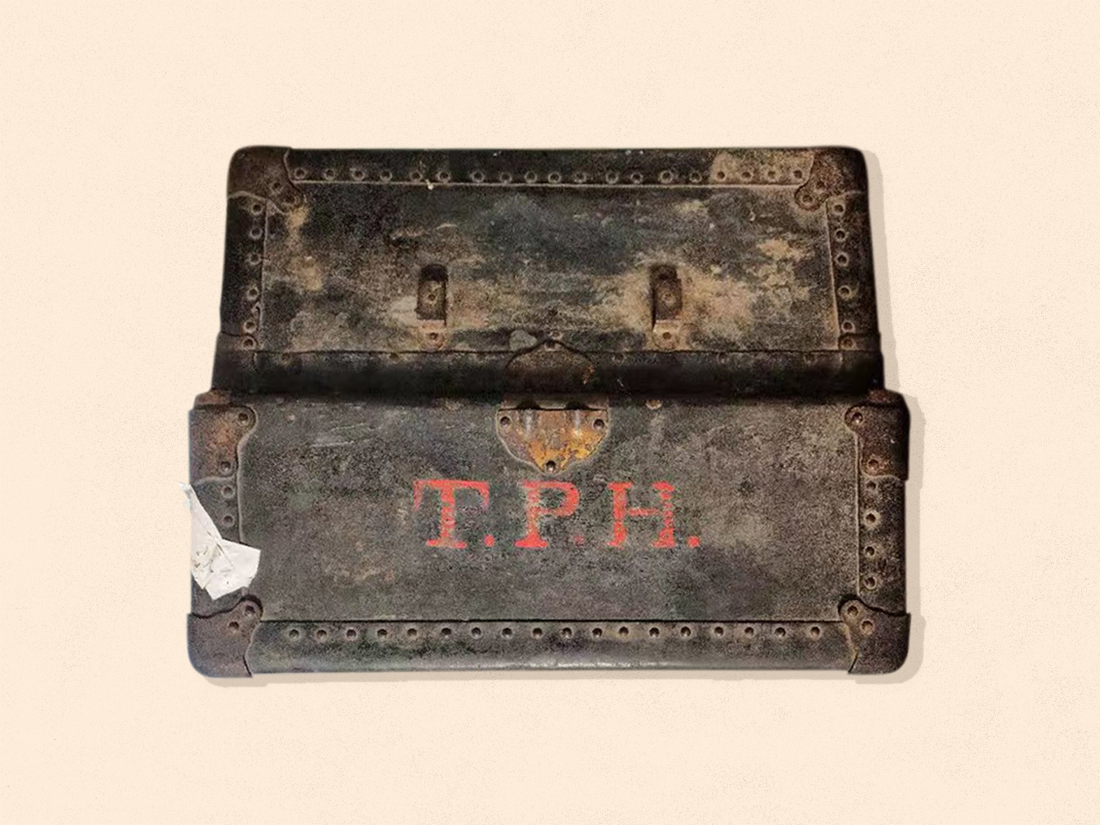 此次捐赠的行李箱具有鲜明的时代特征和个人印记。行李箱主体为木质结构,外层装饰有金属边框和合页,内部设有隔层,便于分类存放物品。其体积较大,尺寸约为102*56*45厘米,适合长途差旅时携带。尤为引人注目的是,行李箱正面醒目地写有红色“T.P.H.”字样,这是侯德榜拼音首字母的缩写,体现了侯德榜先生的个人特色。