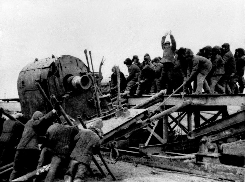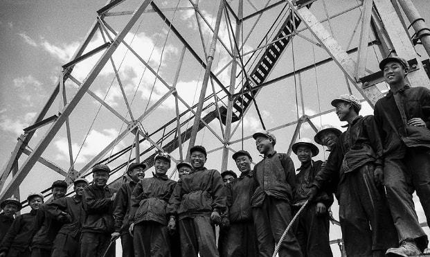 大庆石油大会战中,工人们把5吨重的绞车拉上2米高钻台