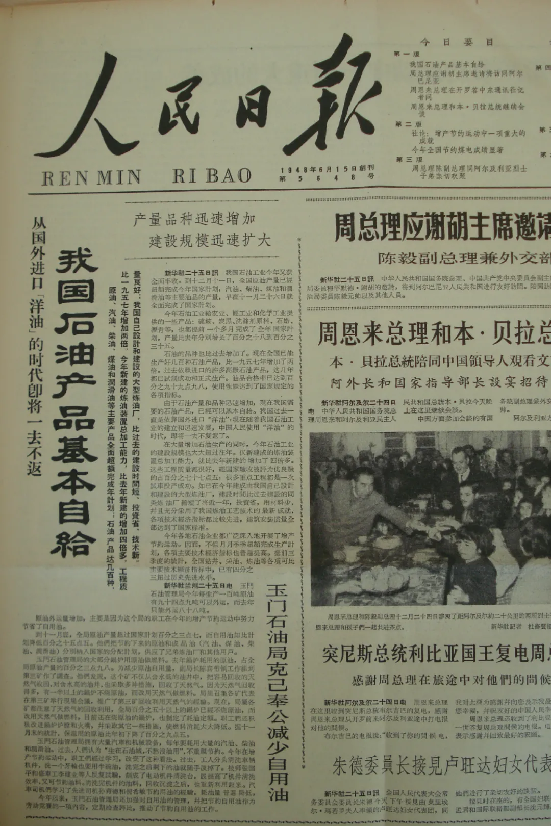 12月,周恩来总理在第二届全国人民代表大会第四次会议上庄严宣布:“由于大庆油田的建成,我国经济建设、国防建设和人民需要的石油,过去大部分依靠进口,现在不管是在数量上或者在品种上,都已经基本自给了。”同月,《人民日报》头版头条《我国石油产品基本自给》,向世界发出自力更生的宣告。